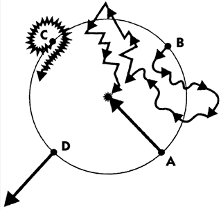 На этом рисунке линия A изображает прямую радиальную линию человека, от рождения религиозно вдохновенного и верно осуществляющего свой религиозный «метод». Линия B есть линия выпадений и блужданий: два раза выпадает этот человек из своего радиуса, гоняясь за химерами, – один раз за химерами эмоционального характера (волнистая линия), другой раз за рассудочными химерами (угловатая линия); два раза возвращается он на свой верный, радиальный путь и перед смертью приходит в Центр. Линия C есть линия беспомощного топтания в пыльных и грязных мелочах жизни; человек живет вне центра, не ищет радиуса и кончает свою жизнь в пошлости.[53]53