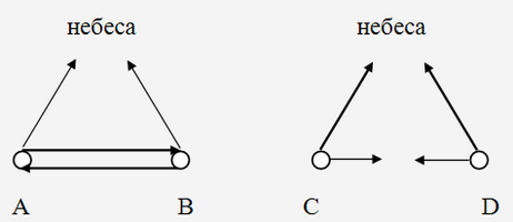 Естественно, что в дружбе главная интенция направлена от личного духа к личному духу, как бы в «горизонтальном» направлении, неся от одного к другому в лучах любви религиозно осмысленные дары; а от совместной молитвы – главная интенция направлена от личного духа к Богу, в восходящем направлении, взнося к Нему личное пламя любви и благодарности, тогда как интенция совместности остается добавочной и непреобладающей. Поэтому молитвенные «стрелы» изображаются на втором рисунке интенсивными чертами и притом в виде двух независимых восходящих линий, которые, однако, сходятся «в бесконечности» религиозного Предмета.