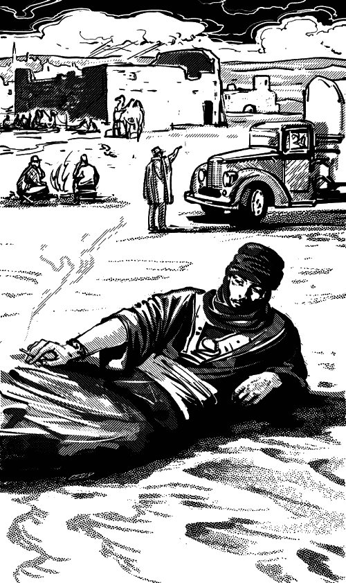 Пламя убогого костра мерцало. Огромная равнина – рег Амадрор, обдутая, казалось, до последней пылинки, все же доставляла ветру достаточно песку, чтобы подпортить скромный ужин. Маленький лагерь геологов прижался к склонам песчаных холмов на краю сухого русла – уэда. Тонко шелестели, напевая звонкую и унылую песню, пучки сухого дрина – жесткого злака Сахары. По склонам дюн с заметным шуршанием скатывался песок, смешанный с кристалликами гипса. Шестеро людей растянулись вокруг костра в одинаковых позах, прикрыв лицо от ветра кольцом руки. Только один, закутанный в просторные складки темной одежды, лежал на животе в свободной позе, высоко подперев голову, и смотрел не мигая в темную даль над костром. Отблески слабого пламени плясали в его больших темных глазах, едва различимых под покрывалом, надвинутым на лоб и закрывавшим рот. Узкая рука с длинными пальцами лениво перебирала застежки седельной сумки, подложенной под голову. Другая небрежно держала сигарету высшего сорта.