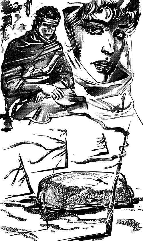 «Песни дрина!» – подумал Тирессуэн, примащиваясь поудобнее и стараясь не шуршать своим жестким плащом о шероховатый ствол колонны. В самом деле, как в зарослях дрина, звенящих под ветром в уэдах, музыка казалась хором колокольчиков, то приближающихся, то удаляющихся. Звенел высокий и чистый голос девушки; как стебель дрина, гнулась ее тонкая фигура в темных складках свободной одежды. Медленно тянули флейта и скрипки грустную, монотонную мелодию. Изредка глухо ударял барабан. В ответ ему руки девушки вздымались плавными взмахами крыльев большой птицы, начинающей свой полет и еще плененной тягой земли. С надменной важностью переступали ноги в цветных, украшенных бусами сандалиях.