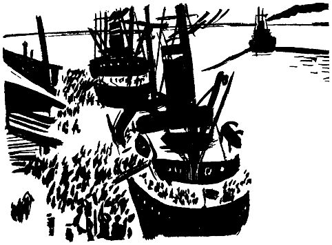 Басят заморенно гудки: из-за синих морей прибыли транспорты. Будто белый медведь драл, будто морж клыками скреб, кровенеют на железных боках царапины, где льды сняли верхний черный слой краски, обнажив красный корабельный сурик.