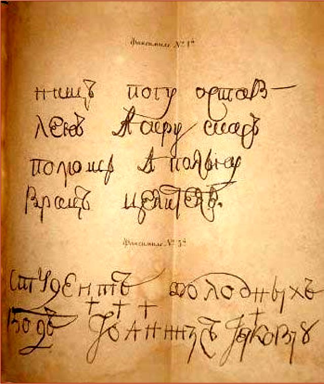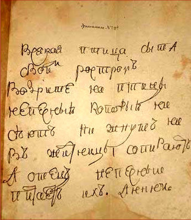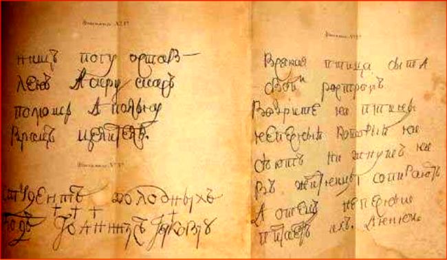 Отв. Цорная риза ни спасает, а альпа (белая) риза у ереси не уводит. Будьте мудри, яко ехидны и цели, яко колюмпы (голуби) и нетленен, яко арпорс (деревья) кипариси, и певки и кедри… 185Д рока, мензис (месяц) иулия XXII. Студент холодных вод Иоаннус Ияковлев.