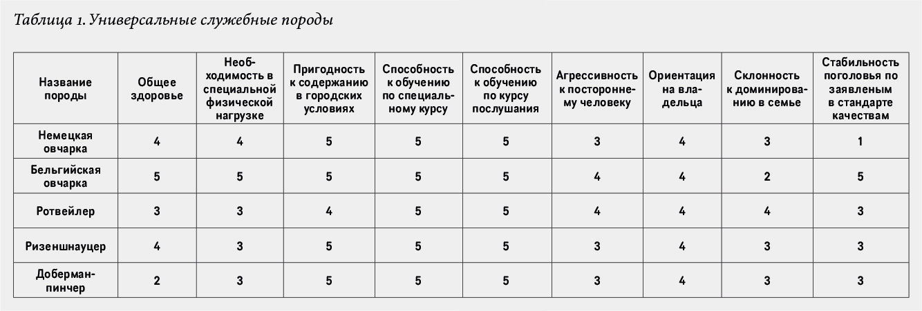Это очень важная информация! Например, если в столбце «Способность к обучению специальному курсу (караульной службе)» собака получает максимальную оценку «5», а в столбце «Стабильность поголовья» – оценку «1», то это значит, что лучшие представители данной породы почти идеальны для использования в избранной дисциплине. И в то же время поголовье нестабильно, и вам с высокой вероятностью может попасться собака, не соответствующая породным стандартам. Если вы не обладаете специальными знаниями, не знаете «правильных» заводчиков, подавляющее большинство которых живет, увы, за пределами нашей страны (я имею в виду заводчиков настоящих служебных пород), то вам будет очень трудно выбрать щенка так, чтобы впоследствии он оправдал ваши ожидания. «Службисты»