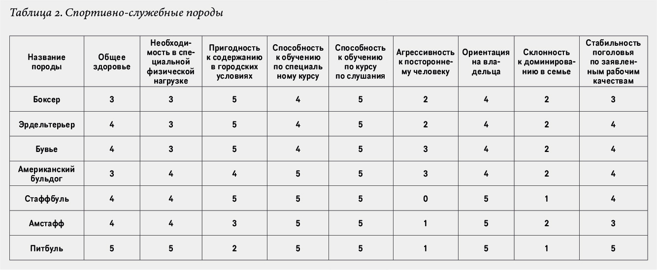 Теперь о самих таблицах. В них включены наиболее популярные на сегодняшний день в России собаки служебных (пользовательских) и спортивных пород. Породы сгруппированы по условной исходной специализации, в соответствии с которой их когда-то разводили. Обсуждаемые параметры оцениваются по пятибалльной шкале. Я не стал включать в их число физические возможности той или иной породы, дабы не вводить потенциальных владельцев в соблазн использовать собаку в качестве живой игрушки для детей – дескать, с ней справится даже ребенок. Однако ответственно заявляю, что представитель любой приведенной в таблице породы физически сильнее человека и позволять ребенку гулять с ним без сопровождения взрослых нельзя.