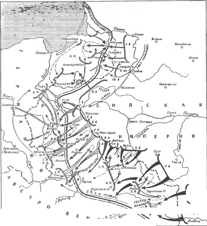 Стратегическая обстановка, сложившаяся к началу сентября, благоприятствовала армиям Центральных держав. На Западпом фронте германские корпуса продвигались к Марне. И хотя французское командовапие готовило контрудар, положение союзных войск было трудным. В Восточпой Пруссии немцам удалось добиться крупного успеха над 2-й русской армией. В Галиции войска левого крыла русского Юго-Западного фронта (3-я и 8-я армии) наступали на львовском направлении. Однако войска правого крыла (4-я и 5-я армии) потерпели неудачу в междуречье Вислы и Буга. Австро-венгры потеснили пх и вышли па линию Люблин, Холм. Наиболее целесообразным способом действий германского командования было бы нанесение удара на Седлец с задачей выйти в тыл армиям правого крыла Юго-Западного фронта, оказать содействие австро-венгерским войскам. Наступление в этом паправлепии предусматривалось германским планом войны.