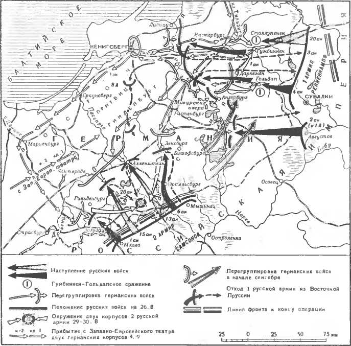 Отход 1-й армии начался в ночь на 28 августа (10 сентября). Германское комапдование действовало вяло и нерешительно. Оно опасалось контрудара русских. Преследование велось медленно. Гермапцам приходилось преодолевать сопротивление русских арьергардов. 31 августа (13 сентября) последовала директива командования Северо-Западного фронта, предписывавшая 1-й армии отойти за Средний Неман, 2-й армии – за Нарев, а 10-й армии, обороняясь па р. Бобр, – прикрыть район Августов. Гродно248. Восточно-Прусская операция завершилась.