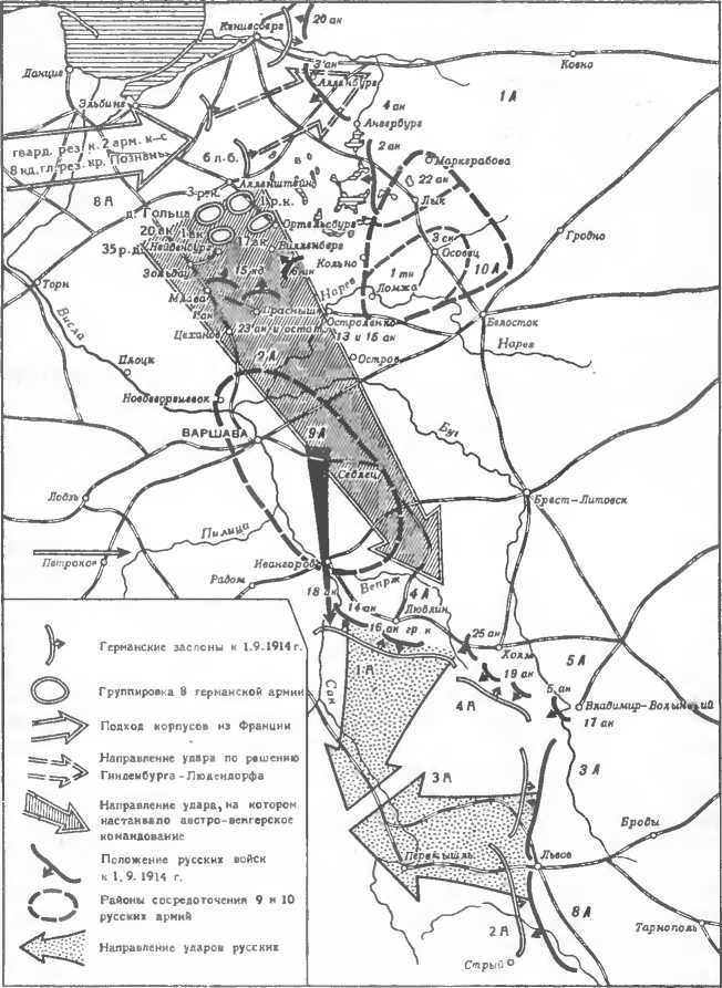 Пока представители высшего воепного руководства России делали различные предположения относительно способа дальнейших действий, положение на фронте быстро менялось не в их пользу. С завершением Восточно-Прусской операции наступил, паконец, момент, когда, по мнепию германского командования, можно было оказать помощь австро-венграм. Этого требовала и обстановка. Поражение войск Австро Венгрии в Галицийской битве поставило их на грань катастрофы. Русские армии угрожали захватить Западную Галицию, Краков п Верхнюю Силезию– важный промышленный райоп. Союзник Германии вновь и вновь просил о поддержке. Командование 8 й германской армии считало наиболее целесообразным осуществить обещапный ав стро-венграм еще до войны удар на Седлец. 1 (14) сентября Гии денбург доносил в главную квартиру: «Наступление па Нарев в решающем направлении возможно через 10 дней. Австрия же из-за Румынии иросит непосредственной поддержки путем пере броски армии к Кракову и в Верхнюю Силезию. Для этого имеется четыре армейских корпуса и одна кавалерийская дивизия. Переброска по железной дороге займет 20 дпей. Большие переходы к левому австрийскому флангу. Помощь туда опоздает. Прошу решения» 305.