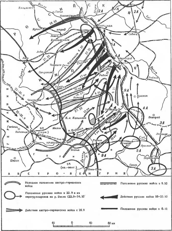 Выполнение своих замыслов обеими сторонами должпо было неизбежно привести к встречным столкновениям. Так оно и случилось. С 27 септября (10 октября) па Средней Висло завязалпсь ожесточенные сражения между 9-й германской армией и войсками 2-й, 5-й и 4-й русских армий. Соединения 2-й армии отражали настойчивые атаки противника, который стремился прорваться к Варшаве с юга. Особенно мужественно действовали части 1-го и 2-го Сибирских корпусов. Двое суток сдерживали сибиряки натиск германцев. Вечером 28 сентября (11 октября) С. М. Шейдеман докладывал Н. И. Иванову: «... сил не хватает, чтобы атаковать все, ползущее вперед» 1Б2. Ночью войска армии были отведены за линию фортов370 371 372 373. Южнее Варшавы, у Гура Кальвария, в течение 28 сентября (11 октября) был переправлен 23-й корпус, на следующий день намечалось перебросить за Вислу и 2-й корпус 5-й армии. Они имели задачу напести удар германцам, идущим с юга на Варшаву, и тем помочь войскам 2-й армии 1Б4. Отход армии Шейдемапа за линию фортов мог поставить корпуса в изолированное положение. Русское командование отказалось от переправы 2-го корпуса, а 23-й корпус в ночь на 29 септября (12 октября) был возвращен на правый берег Вислы.