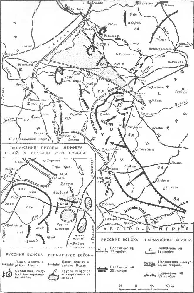 Замысел германского командования был разгадан в первый же день Лодзинского сражения. 5 (18) ноября штаб 2-й армии так оценивал обстановку: «Направляя сильные удары в промежуток между 1-й и 2-й армиями, а также начав наступление и с запада, немцы, видимо, стремятся отрезать армию от Варшавы, ее окружить» 422 423. Одновременно штаб армии высказывал мнение о наиболее целесообразном способе противодействия намерениям врага. «Необходимо, – докладывал он штабу фронта, – быстрое и энергичное наступление 5-й армии из-за левого фланга 2-й армии п движение каких-либо частей с фронта Лович, Скерневицы во флапг немцам, стремящимся обойти правый фланг армии и отрезать ее от сообщений с Варшавой» 20э. Эти соображения и были положены в основу всех последующих действий русского командования, направленных на срыв охватывающего маневра 9-й германской армии.