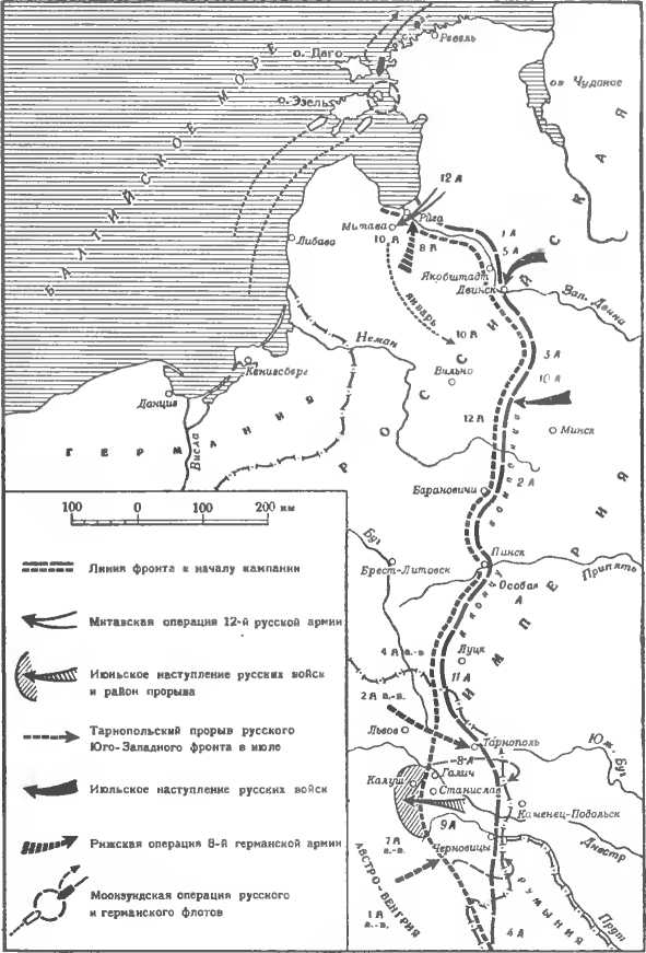 Ступлсттис, выйти к железной дороге Крснцбург, Митава и, угрожая флангу п тылу якобштадтской н двинской группировок про тивника, заставить его оттянуть свой фронт от Западной Двины. Но этого не было сделано. Наступление свелось только к некоторому улучшению расположения русских войск. «Выиграв пространство, – говорилось в приказе командующего 12-й армией, – мы сократили наш фронт на 5 верст, выдвинувшись вперед до 2—5 верст». Столь малый успех стоил русским до 23 тыс. человек убитыми, ранеными и пленными807.