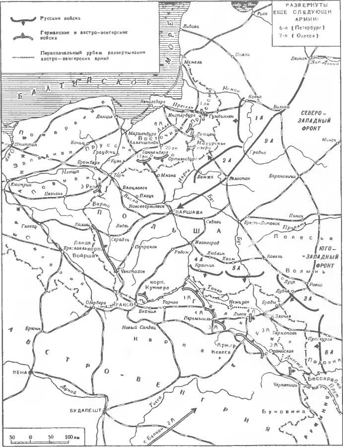 Германское командование развернуло в Восточной Пруссии 8-ю армию генерал-полковника Притвица. Участок границы от Торна и южнее прикрывался ландверными соединениями, составлявшими корпус Войрша. Австро-Венгрия развернула против России на линии Саидомир, Перемышль, Станислав, Черновицы четыре армии: 1-ю генерала Данкля, 4-ю генерала Ауффенберга, 3-ю генерала Брудермана, 2-ю генерала Бен-Ермоли209. Левый фланг этой группировки прикрывался в районе Кракова корпусом Куммера.