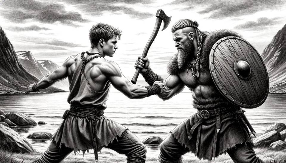 Но на этом мы не остановились. Эйвинд, разгоряченный, принес деревянные топоры и щиты. И здесь я смог его удивить. Моё прошлое «я», Вадим Васильевич, не был спортсменом, но был фанатом исторической реконструкции. Десятки часов, проведенных в клубе «Северный Ветер» на тренировках по бою на мечах и топорах, вдруг ожили в мышечной памяти этого молодого тела. Я был техничен. Точен. Быстр. Я не молотил по щиту, а искал слабые места, бил на опережение, использовал инерцию оружия.