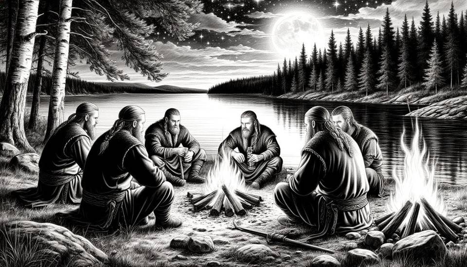 Вскоре в центре лагеря запылали костры. Не один, а несколько. Воздух наполнился дразнящими запахами – жареной на вертеле дичи, запеченной в золе рыбы, дыма смолистых сосновых веток. Воины расселись кругами. Достали припасенные рога и деревянные кружки. Пошел эль, густой и мутный. Запахло настоящей походной жизнью.