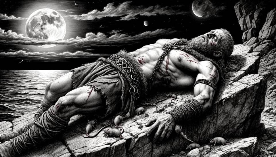 Голого и беспомощного, его повалили на спину на огромный плоский валун у самой кромки воды. Затем его крепко привязали к булыжнику сыромятными ремнями. Он лежал, тяжело дыша, его грудь вздымалась в такт отчаянным, но тщетным попыткам вырваться. Камень был холодным и шершавым, он резал и царапал спину.