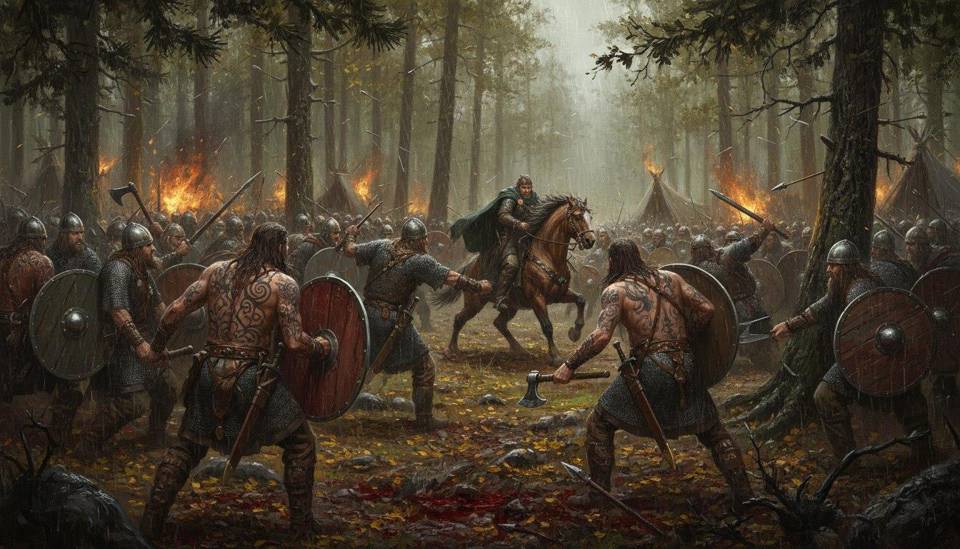 Сначала это был одинокий свист. Потом их стало десять, двадцать, тридцать. Они летели беспорядочно и жутко, будто чаща выплёвывала всю накопившуюся ярость. Стрелы впивались в землю у копыт коней, с глухим стуком ударяли в щиты передовых рядов, находили щели в доспехах.