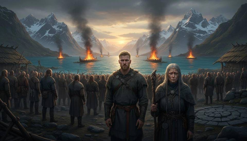 Берег представлял собой душераздирающее и одновременно величественное зрелище. Десятки плотов и несколько настоящих ладей, уцелевших в бою или поднятых со дна бухты, стояли на отмели, готовые к своему последнему плаванию. Они были убраны еловыми и сосновыми ветвями, а на них, уложенные на щиты, покрытые лучшими плащами, шкурами и кольчугами, лежали тела павших. Воздух был густым и тяжелым от запаха смолы, хвои, морской соли и смерти. Сотни людей столпились на берегу – бледные, закопченные, с пустыми от горя или застывшими в суровой решимости глазами. Тишина стояла гнетущая, нарушаемая лишь мерным плеском волн, криком чаек и сдержанными всхлипами.