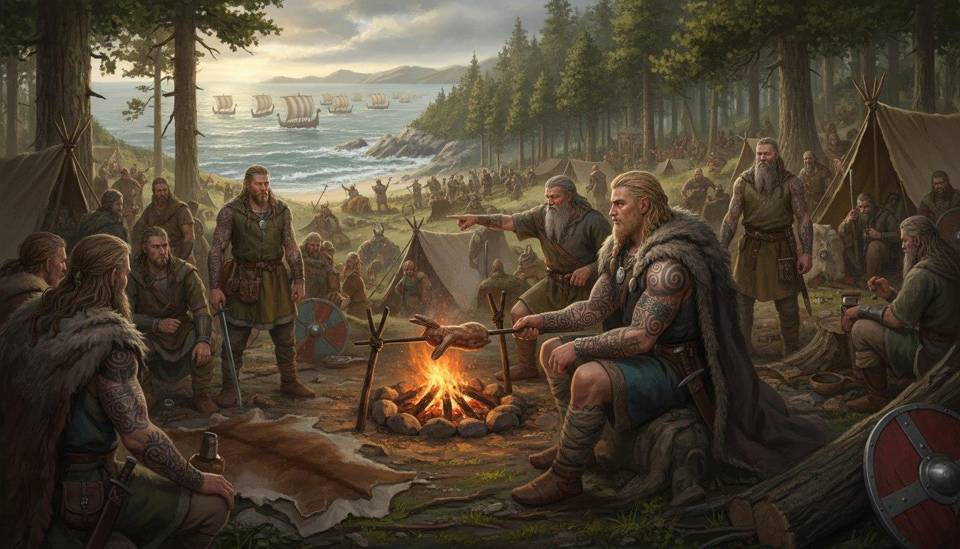 Точильные камни «цзвинькали» о сталь топоров и мечей. Слышался мерный стук молотков, кто-то сшивал разорванные кольца кольчуг. Другие, уже закончив с оружием, сидели небольшими группами. Кто-то не спеша играл в кости и подбрасывал их на растянутой на земле шкуре. Кто-то чистил и натирал маслом щиты, сложенные в аккуратные пирамиды. Кто-то просто молча смотрел на море, попивая из дорожных рогов разбавленную медовуху – крепкую, но не до безумия.