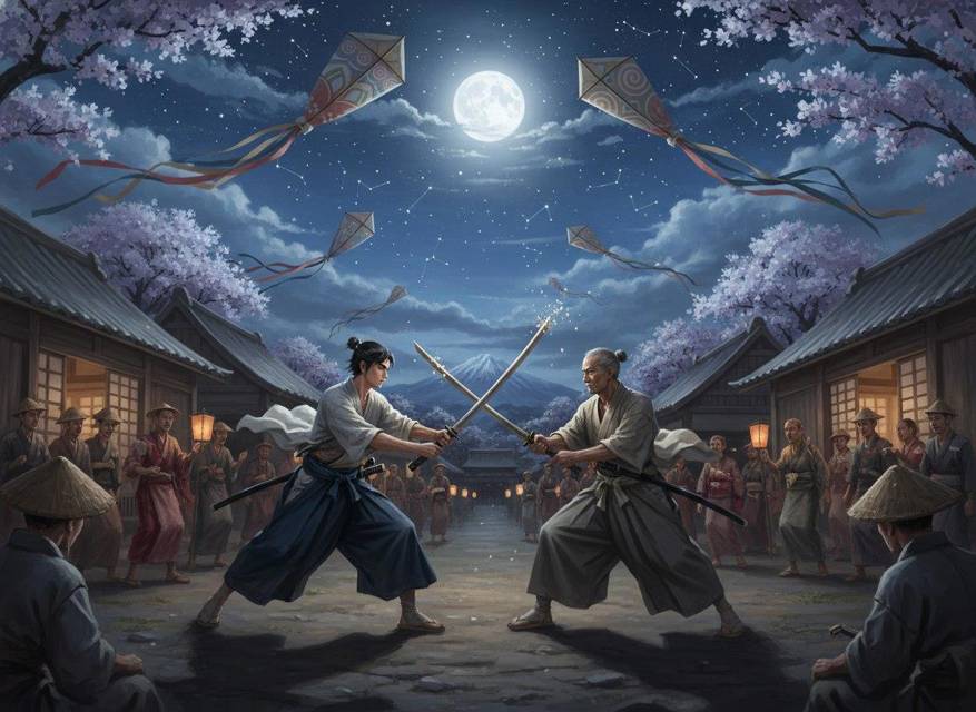 Над нами в лунном небе тихо и величественно проплывали бумажные карпы и драконы. Лунный свет лился сквозь их расписные бока, и они казались призраками, наблюдавшими за поединком людей с высоты с холодным безразличием вечности.