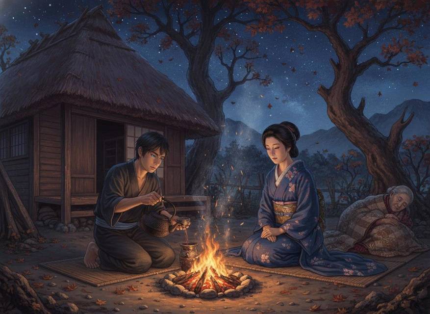 Пламя осветило темную землю и соломенные крыши. Ночной двор заиграл новыми красками. Митико удобно устроилась на низкой скамье, подложив под бок свернутое одеяло. Каэдэ сидела на краю веранды. Огонь играл в складках ее индигового кимоно – его свет превращал темный шелк в живую воду с золотыми бликами.