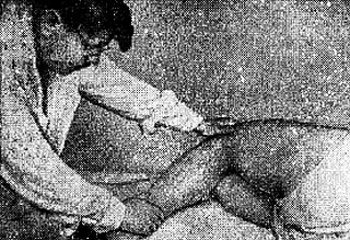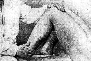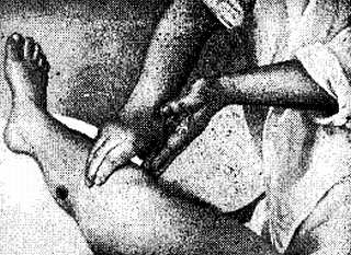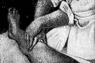 Рис. 31. Растирание буграми больших пальцев коленного сустава
