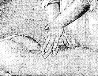 Это же движение производится и при наложении на живот тыльной стороны кисти, причем отягощает также левая рука пальцами, положенными на ладонь поглаживающей руки.