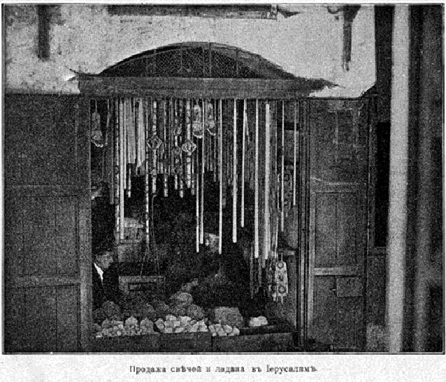 Мне хотелось из подражания народу купить в здешних лавках пучёк больших свечей, разукрашенных золотом и цветами; но, это может странным показаться, в Иерусалиме нет в продаже восковых свечей. Я не умею определить материала, из которого они здесь составлены. Может быть, это был парафин или что-нибудь в этом роде, но только свечи иерусалимские, когда их держишь в руках, неприлично размягчаются. Я нашёл немного настоящих восковых свечей, выписанных из русского епархиального завода, только в лавочке Палестинского общества и из них составил священный пучёк в тридцать три свечи, по числу лет земной жизни Спасителя. Некоторые, имея в виду побольше привезти свечей в Россию, берут с собой в храм по два пучка.