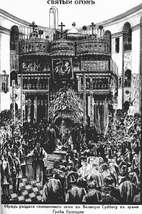 Весь храм, все стены, карнизы, всё усеяно народом. Море голов! У всех пучки свечей. Теснота, давка, удушье. Лица красные, потные. Впрочем, мне было удобно идти между рядами солдат. Кавасы, а за ними толпа европейцев, пошли по коридору в обход греческого храма на северную сторону. Когда поравнялись со спуском к приделу Константина и Елены, я заметил, что там очень мало народа. Думаю, чего же больше искать: тут просторно и всё-таки в храме, а не во дворе. Придел Константина и Елены находится в просторном помещении и принадлежит армянам. Алтарь огорожен решёткой. Иконостаса вовсе нет, да и окон сравнительно немного. Русских паломников почти не было. Сидело здесь десятка два туземцев, да бегали дети их. В ожидании огня я раскрыл взятое с собой Евангелие и стал читать. Ребятишки, лет по двенадцати, подняли возню, как на улице. Они играли, шалили, бегали, кричали, и никто им не делал ни малейшего замечания. Вдруг пронёсся издали ужасный шум, и в это время по лестнице к нам быстро спустились три католических монаха. Я знаю, что католики не принимают участие в торжестве чудесного огня, разве только как зрители, а потому у меня мелькнуло подозрение, не преследуют ли их арабы в эти минуты проявления у них сильного энтузиазма. Но, нет, монахи весело разговаривая, прошли за решётку и стали ожидать, как и я. Это меня тоже удивляло: капелла католиков непосредственно примыкает к ротонде Гроба Господня с северной стороны, так что им удобнее было бы видеть у себя момент первой подачи огня из кувуклии.