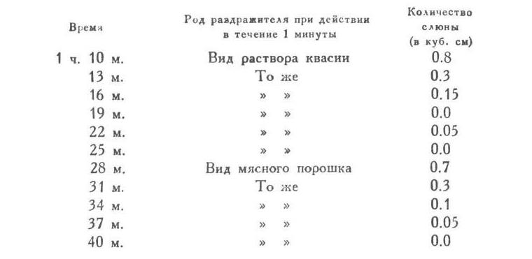 Когда кислота на расстоянии при повторении перестает вызывать истечение слюны, то, кроме аналогичного вышеприведенному способу (т. е. вливания кислоты в рот или подкармливания собаки мясным порошком), можно восстановить рефлекс на расстоянии и тем, что собаке показывают мясо, смоченное кислотой. Нужно заметить, что одно мясо как пища, богатая водой, вызывает только слабое отделение слюны, а из околоушной слюнной железы во многих случаях и совсем не бывает слюноотделения. В случае пищевых веществ на их действие на расстоянии очень отчетливо влияет состояние голода кли насыщения животного. Во втором случае реакция гораздо меньше; при повторении опыта она исчезает гораздо скорее, чем в первом случае.