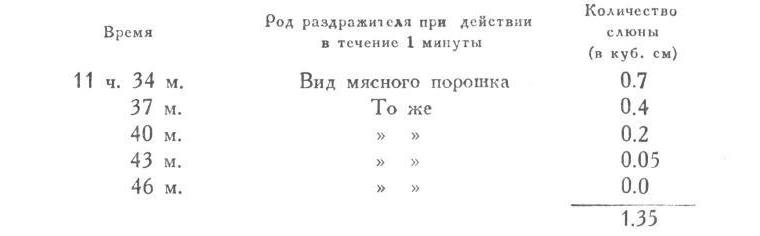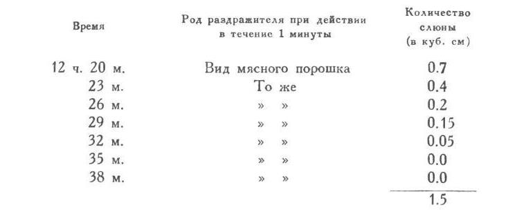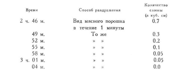 Возбуждение производится опять видом мясного порошка, каждый раз в течение 1 минуты. При повторении этих раздражений через 2 минуты рефлекс исчезает через 15 минут, при промежутке в 4 минуты – через 20 минут, при 8-минутном промежутке – через 54 минуты, а при 16-минутном рефлекс все еще остается и через 2 часа. Снова при раздражении через 2 минуты рефлекс исчезает к концу 18-й минуты.