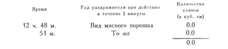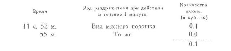 B 11 часов 58 минут вливают собаке в рот кислоту, получают всего 3.5 куб. см слюны и опять продолжают опыт с мясным порошком.