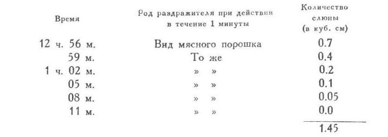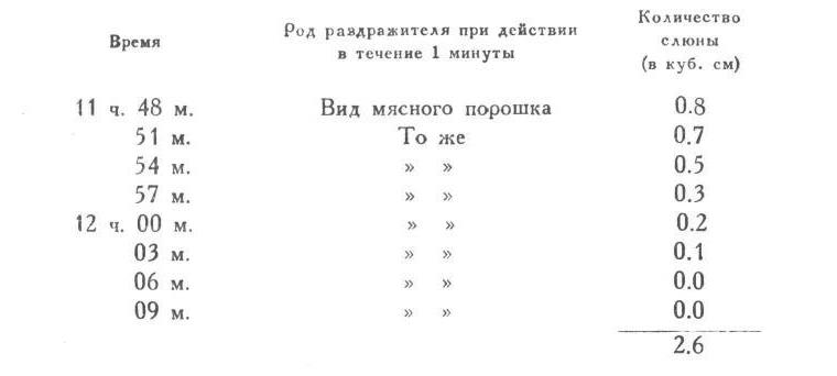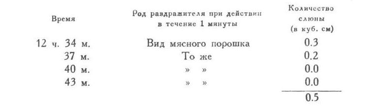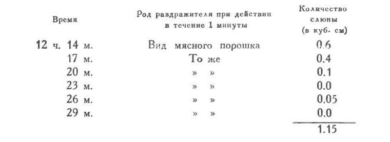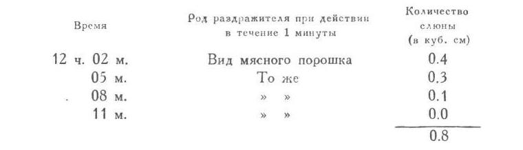 B 12 часов 30 минут дают снова собаке есть мясной порошок, получают всего 3.4 куб. см слюны и продолжают опыт.