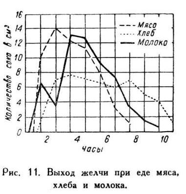 Теперь другой вопрос: каким образом выводится желчь в пищеварительный канал, какие условия влияют на это? Этот вопрос нас больше должен занимать. Что же мы в этом отношении знаем? Первый основной факт мы установили. Когда пищеварения нет, нет и выделения в пищеварительный канал желчи; как только появляется в пищеварительном канале пища, так начинается и выливание желчи. Это вы видели вчера. Да и сегодня то же самое: к началу опыта отделения не было или было очень слабое, когда же собаке дали молоко, то началось выливание, желчь потекла в пищеварительный канал. Оказывается при этом, что и здесь, так же как при других жидкостях, течение желчи совершается очень различно. Если вы проделаете соответствующие наблюдения, то увидите, что разная пища вызывает различное количество желчи, ход выливания каждый раз различен. Я вам сообщу некоторые данные относиВсего больше вызывает выливание желчи жирная пища; всего меньше углеводная вызывает среднее количество желчи. Что же касается распределения желчеотделения по времени, то в этом отношении наблюдается следующее (рис. 11). При молоке обычпосле вливания начинается тельно выливания желчи. пища, хлеб например; мясо но через некоторое время выделение желчи, продолжающееся минут 15-20, потом наступает перерыв – минут 40 ничего не выделяется, а потом выделение начинается снова. При хлебе и мясе такого соотношения не наблюдается. Там тоже имеются маленькие волнообразные колебания, но они стоят в связи с поступлением пищи. При хлебе выделение начинается не сразу, иногда минут через 20–30. Значит, и выделение желчи стоит в прямом соотношении с родом пищи, извиняется в зависимости от того, что поступает в пищеварительный канал.