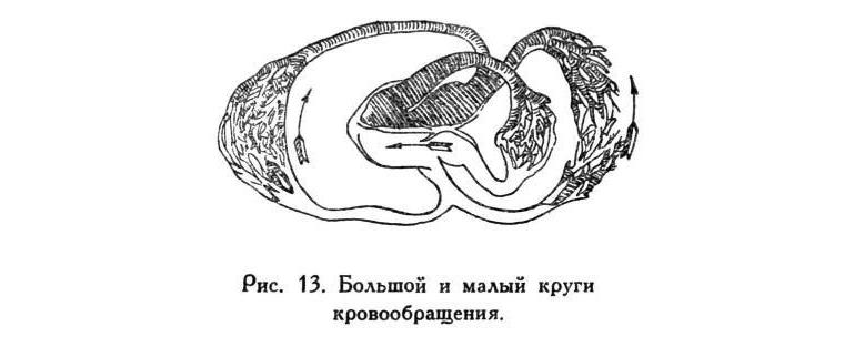 Вы знаете, что в центре кровеносной системы лежит полый орган – сердце. Продольной перегородкой оно делится на две половины; каждая из этих половин делится еще пополам горизонтальной перегородкой на предсердие и желудочек. Ну, а теперь рассмотрим путь крови. Начнем с нижней части левой половины сердца. Сначала кровь идет отсюда в крупнейший сосуд всего тела – в аорту. Аорта делится на артерии, на все более и более мелкие сосуды до микроскопических трубочек – капилляров. Потом эти трубочки начинают собираться, соединяться, образуют вены, число их делается все меньше, и, наконец, остаются только две трубки – две больших вены, которые, сливаясь, впадают в правое предсердие. Из правого желудочка выходит легочная артерия. Это артерия тоже начинает делиться, трубочки уменьшаются, число их увеличивается: трубочки распадаются на капилляры, капилляры собираются в более крупные трубочки (вены) и одной легочной веной впадают в левое предсердие. Вот вам весь путь, который проходит кровь (рис. 13). Это и есть круг кровообращения. Вы видите, что он, собственно, распадается на два круга. Тот, который начинается аортой н возвращается в сердце, в правое предсердие, носит название большого круга кровообращения. Другой же круг, который начинается в правом желудочке, а кончается в левом предсердии, носит название малого круга кровообращения. Большой круг кровообращения пронизывает все тело, малый же относится только к одному органу, к легким. Вот вам общая схема кровообращения. Что же касается названий, то надо думать, что они вам известны. Аорта распадается на артерии, артерии на капилляры, капилляры собираются в вены.