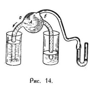 В замкнутой системе сосудов кровь находится в беспрерывном движении. Движение это обусловливается работой сердца. Мое дальнейшее изложение будет иметь своей задачей показать вам, как действует сердце; показать, что оно играет роль насоса. Следовательно, надо уяснить себе сперва, работает сердце. В доказательство того, что сердце действует как насос, я займу вас описанием очень простого, самого обыденного прибора, который, однако, представляет очень точно работу сердца. Вам надо понять этот прибор совершенно ясно. Вот вам этот прибор (рис. 14). При его помощи я могу совсем свободно перекачать воду из одного сосуда в другой. Это есть, стало быть, насос, который одним концом всасывает жидкость, другим нагнетает. Так вот, и сердце по сущности его действия совершенно уподобляется этому прибору, почему вполне законно начинать изучение сердца с ознакомления с этим прибором. Но прежде всего, как же устроен этот насос? Вы видите каучуковый мешок А с двумя трубками а и справа и слева. В местах перехода его в трубки находятся заслонки, которые открываются в одну сторону. Там есть приспособление, допускающее клапаны открываться только в одну сторону. Вот какая несложная конструкция. Сейчас прибор наполнен жидкостью. Я давлю его руками. Вы видите, что жидкости выдавливается только в левый сосуд. Теперь я отпускаю шар. Вы видите, что в левом сосуде ровно ничего не изменилось, а в правом уровень воды понизился. Шар наполнился водой, и мы опять у исходного положения. Следовательно, в тот момент, когда я давлю шар, он действует как нагнетающий насоc; когда перестаю давить – как всасывающий. Вот вам вся работа прибора. вается конструкцией прибора. Когда