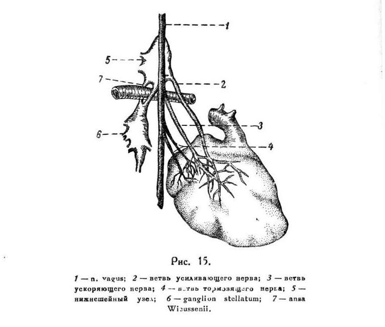 В отношении ускоряющего нерва было еще вот какое затруднение. Оно заключалось не только в том, что о его существовании не возникала и мысль, трудность заключалась еще в том, что ход нерва очень сложный; волокна его проходят глубоко, и требовалось большое умение, чтобы добраться до них. Я вам сейчас покажу ход этих волокон. Я нарисую это, конечно, схематически, лишь для того, чтобы была видна самая суть. Вот здесь у вас продолговатый мозг. Туг, значит, нервы, берущие начало, будем считать, от продолговатого мозга. Затем эти нервы спускаются по спинному мозгу и затем по rami communicantes идут в симпатический нерв. Ну вот, это – симпатический нерв. Значит, эти нервы идут по спинному мозгу вниз, затем несколькими ветвями входят в симпатический нерв. По симпатическому нерву эти волокна поднимаются вверх до ganglion stellatum, потом двумя ножками, так называемыми ansa Wieussenii, идут в нижнешейный узел, откуда уже отходят ветви, направляющиеся в сердце. Перед вами схема иннервации сердца (рис. 15). Вот тут проходит вагус; его ветви смешаны здесь с ветвями ускоряющего нерва.