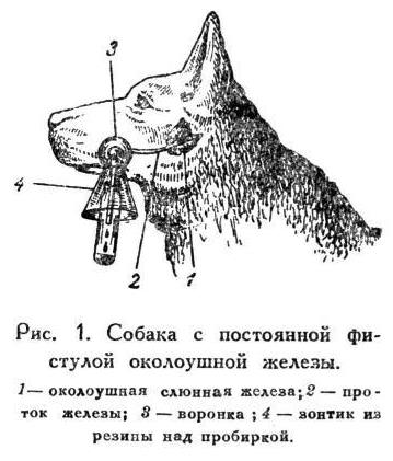 И вот, чтобы придти на помощь этому, в старое время употреблялся такой метод. Снаружи, там, где проходит проток, резали кожу (это можно сделать и без хлороформа), доставали проток слюнной железы, разрезали его и вставляли в него трубочку. Таким образом слюна текла уже не в рот, а в трубочку. Дело исследования стало легче и лучше. Слюна теперь получалась чистая. Но неудобство этого приема состояло в том, что рана зудела и раздражала собаку, а это могло отразиться на верности результатов. Когда же рана начинала заживляться, то большею частью трубочка выпадала.