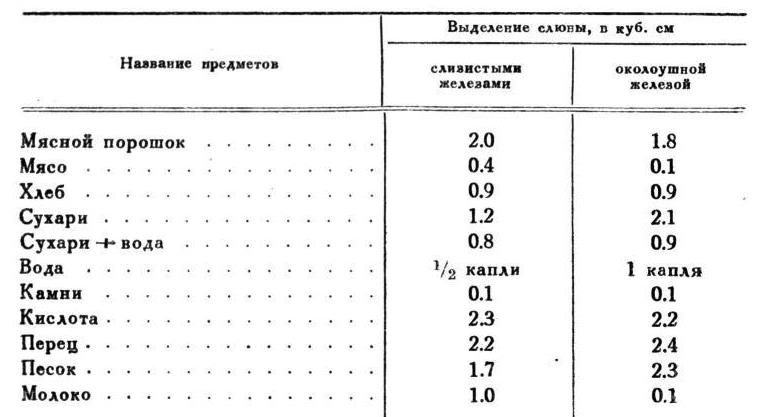 Теперь мы напишем всю таблицу отделения слюны на различные вещества, начиная со вчерашних опытов.