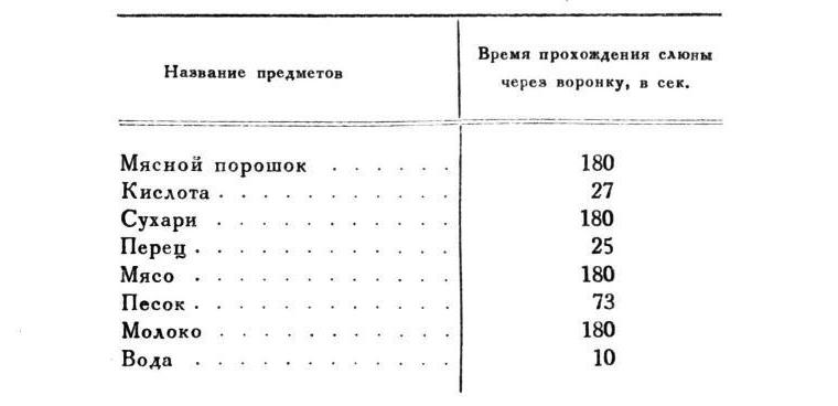 Теперь обращу ваше внимание на следующие цифры. Поражает факт, что песок и камни чрезвычайно разнятся в отношении количества слюноотделения. Песок вызывает гораздо больше слюны, хотя песок ведь это те же камни, только в раздробленном виде. Но понять причину этой разницы нетрудно. Камни и песок нерастворимые вещества, действующие на стенки рта только механически. Камни, когда они попали в рот, надо лишь выбросить, а очищать от них рот нечего, промывать рот после камней не нужно, слюне делать нечего, ее и нет. Песок – другое дело. Пусть он нерастворим, но он пристает к слизистой оболочке и его надо отмыть, поэтому и течет слюна. Вы припомните свои собственные наблюдения на себе. Попробуйте освободиться от чего-нибудь породистого, если рот сухой. Это очень мучительно. Очистить рот в таких случаях можно только струей воды. Вот вам для этого и слюна. 1ак что это объяснение понятно.
