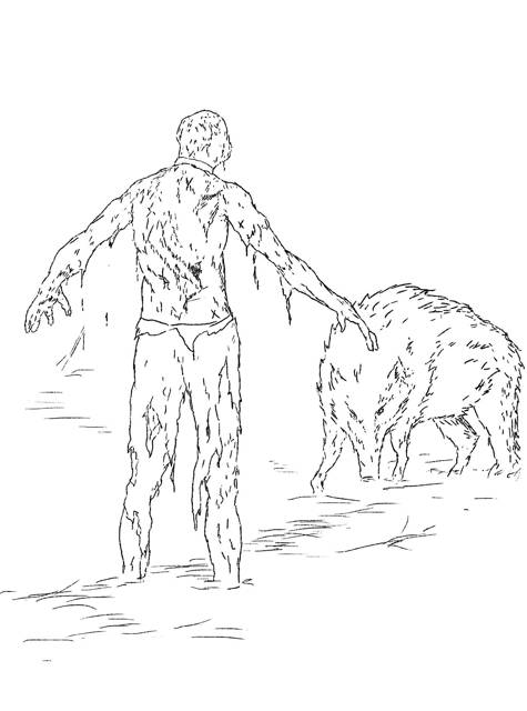 'Непомерно высок становится зверь этот и широк в кости. Порою покрывается шерстью, грубой и жёсткой, а иног** ** шуёю. Ногти его широки становиться, а мышцы сильны и тверды. Кожа грубеет, и глаза становятся круглы. И тьма в них вытесняет белизну по краю.