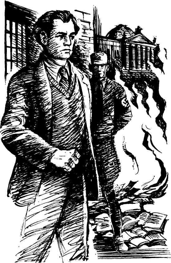 Ч т е ц в к р а с н о м. Десятого мая в Берлине, на площади перед университетом, в небо взметнулись огненные языки огромного костра. Вокруг площади стояли коричневые и черные шеренги штурмовиков и эсэсовцев. Подъезжали машины, доверху груженные книгами. Гремели оркестры, раздавались воинственно-ликующие возгласы. На автомобиле прибыл сам министр пропаганды Геббельс. Эта единственная в своем роде драма сожжения книг разыгралась в тысяча девятьсот тридцать третьем году. Она сопровождалась пением «Хорста Весселя» и национального гимна Германии. В пламени костра горели произведения Карла Маркса, Фридриха Энгельса, Ленина и Сталина, Розы Люксембург, Карла Либкнехта и Августа Бебеля. В огонь летели сочинения писателей-пацифистов, книги буржуазных поэтов и социальных реформаторов, чьи имена еще совсем недавно считались в Германии величайшей гордостью. Огонь пожирал книги Томаса Манна, Генриха Манна, Леонгарда Франка, Зигмунда Фрейда, Стефана Цвейга, Арнольда Цвейга, Бертольта Брехта, Анри Барбюса, Ильи Эренбурга, Лиона Фейхтвангера, Иоганнеса Бехера, Ярослава Гашека, Эгона Эрвина Киша, Роберта Неймана, Эриха Марии Ремарка, Людвига Ренна, Эмиля Людвига, Теодора Вольфа, Якоба Вассермана, Генриха Гейне. Это сожжение прогрессивных творений духа совершалось возле памятников Александру и Вильгельму Гумбольдтам, установленных перед университетом. Вильгельм фон Гумбольдт, основатель этого университета, хотел поднять юнкерскую Пруссию до уровня западного буржуазного мира. А теперь у подножия его памятника немецкие студенты, одетые в форму штурмовиков, уничтожали лучшие образцы прогрессивной литературы… «Дойчланд, Дойчланд юбер аллес».