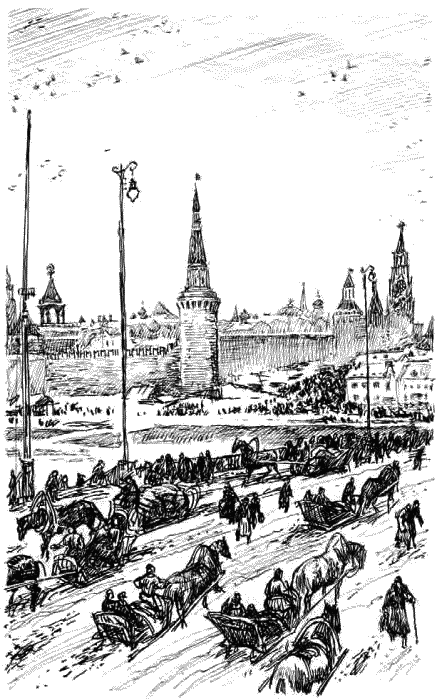 Народу гуще. Несут вязки сухих грибов, баранки, мешки с горохом. Везут на салазках редьку и кислую капусту. Кремль уже позади, уже чернеет торгом, доносится гул. Черно – до Устьинского моста, дальше.