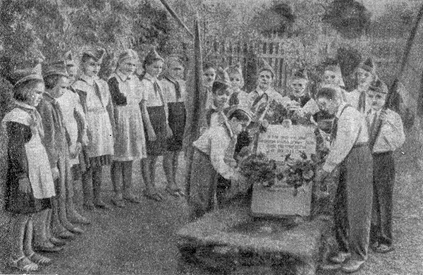 Пионеры дружины имени Лукьянова Волховской школы любовно ухаживают за могилой героя.