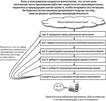 При необходимости вернитесь к шагам 0, 1, 2 и 3Современная разработка является итеративным процессом. Это особенно справедливо в отношении разработки приложений для мобильных устройств. Исходя из своей квалификации и опыта, вы принимаете первоначальные решения, которые кажутся вам наилучшими, и при необходимости впоследствии пересматриваете их. Наличие опыта проектирования приложений для мобильных устройств поможет вам принять лучшие решения, но никогда не сделает их идеальными. Всегда вкрадется какая-нибудь непредвиденная проблема, которая вынудит вас заново пересмотреть свой проект и внести в него небольшие уточнения или, как это часто случается, радикальные изменения. Значительное место в оставшейся части книги отводится тому, чтобы научить вас с самого начала принимать наилучшие решения и одновременно привить необходимые технические навыки, которые позволят оставить открытыми двери для пересмотра проекта, если это потребуется.