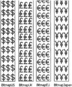 В качестве оптимизации первого порядка мы могли бы создать битовые образы строк символов валюты для каждой страны, то есть растровое изображение 30×10 пикселей для строки $$$ и аналогичные изображения для других видов валют. Вероятно, такие битовые образы можно было бы очень быстро копировать поверх нашего фонового изображения, предусмотрев для этого цикл, который выполнялся бы столько раз, сколько необходимо, с последующим отсечением верхушки символов в соответствующих точках, чтобы обеспечить нужную высоту столбцов. В действительности, мы можем поступить еще лучше. Почему бы не заготовить заранее битовые образы, представляющие для каждой валюты столбцы максимальной высоты? Всего нам нужно четыре таких заготовки: одна для США (US), одна для Японии (Japan), одна для Великобритании (UK) и одна для стран Европейского Союза (EU). Когда нашему приложению необходимо нарисовать любой из этих столбцов, оно просто использует соответствующий битовый образ и копирует его часть на поверхность нашего рисунка. Как и в случае фонового изображения, если имеется возможность создавать изображения на стадии проектирования, то можно прибегнуть к услугам дизайнеров, которые придадут изображениям максимально привлекательный внешний вид. Пример таких заранее заготовленных столбцов представлен на рис. 11.9.