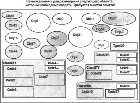 Иногда количество используемых активных объектов может возрастать настолько, что простое удаление пассивных объектов по типу "отслеживание и очистка" не может обеспечить освобождение достаточно большого объема памяти для того, чтобы исполнительный механизм мог создать и разместить в памяти новые объекты, которые требуются выполняющемуся коду приложения. В случае возникновения подобных ситуаций выполнение приложения должно быть прекращено из-за нехватки памяти. Состояние приложения, достигшего в ходе своего выполнения такого состояния, показано на рис. 3.7.