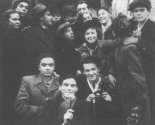 Демонстрация. Нам так хорошо вместе. Алеша Одинец, Владик Заманский, Коля Завитаев, Галя Грозина, Ада Петренко, я, Виктор Карлович Монюков, Володя Пронин, Маргоша Володина, Юрочка Ершов, Валя Рудович… (Фамилии других забыла.) Москва. 1955 год.