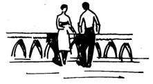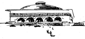 По правому берегу внимание привлекает двухкилометровый проспект Руставели. Мы видим обращенные в нашу сторону фасады зданий одной стороны – колоннаду Грузинского филиала института марксизма-ленинизма, своеобразное здание теата оперы и балета им. 3. Палиашвили, зеленые массивы сада Коммунаров и белый силуэт Кашветской церкви, гостиницу «Интурист» и, наконец, глубокую чашу площади Ленина с возвышающимся в центре памятником. Мы не видим фасадов зданий другой стороны проспекта Руставели, но высокий шпиль, около площади Руставели, говорит о том, что это здание треста горнорудной промышленности, а прямо перед нами крыша Дома правительства.