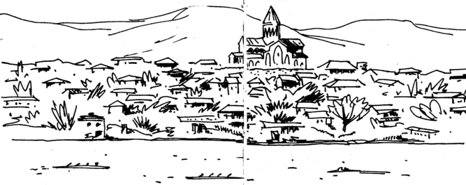 Город постепенно расширяется, занимая вс:о широкую часть котлована и далеко подымаясь по склонам. Эта часть города отстроилась в XIX веке, приняв в свои границы деревни Кукиа и Чугурети. Далее видны обращенные в нашу сторону новые жилые дома вдоль набережной и параллельный ей проспект Плеханова, который тянется до стадиона «Динамо». Мы видим золотой шпиль Тбилисского вокзала, а за ним виднеется новая широкая, уходящая вдаль Октябрьская улица. Это уже Ленинский промышленный район – ниже, до самого берега Куры простираются строения Сталинского района.