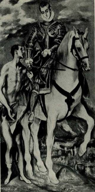 Большинство картин, написанных Греко для этой капеллы, покинуло свои места, и среди них одна из лучших – «Св. Мартин, делящий свой плащ с бедняком», которая находится теперь в Национальной галерее Вашингтона. Но даже копия, заменившая здесь подлинник, дает некоторое понятие об этой прекрасной картине, в которой святой как бы воплощает героя рыцарских романов, столь любимых толедцами. У него красивое, бледное, благородное с оттенком грусти лицо; изящество его фигуры подчеркнуто блестящими, облегающими позолоченными доспехами и элегантно накинутым плащом интенсивно изумрудного цвета, контрастирующего с ярко-красным цветом сапог, на которых блестят золотые шпоры. Ослепительна белизна породистого коня в нарядно расшитой красной сбруе. Бедняк еле прикрыт рубищем, таких бедняков можно было видеть на трудных каменистых дорогах Кастилии. Фоном служит пейзаж окрестностей Толедо с серо-лиловатыми скалами, покрытыми местами кустами зелени. На первом плане виднеется знаменитая машина для подъема воды, сконструированная Джанелло де Торре.