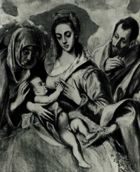 В 1608 году Греко заключил договор с управителем госпиталя Таверы на выполнение ретабло для церкви госпиталя. Но работа эта не была окончена художником, за исключением нескольких картин, хранящихся теперь в музее госпиталя. Полно очарования «Святое семейство», замечательное по красоте нежно-голубых, розоватых, палевых прозрачных тонов, подчеркивающих идилличность сцены и особую привлекательность Марии с ее нежной, трогательной красотой. Мадонна кормит младенца, придерживая его своей изящной нервной рукой. Лицо Анны, как бы предчувствующей будущее младенца, полно затаенной печали. Печально и лицо Иосифа, нежно держащего левой рукой ножку Христа. Иосиф изображен не стариком, как обычно, а мужчиной во цвете лет. Слаженность жестов рук персонажей придает композиционному построению картины особый ритм.